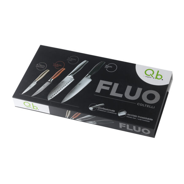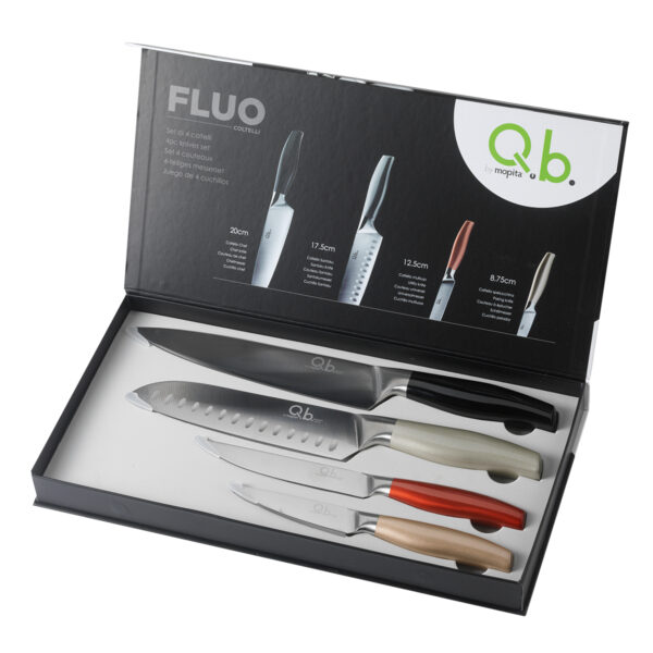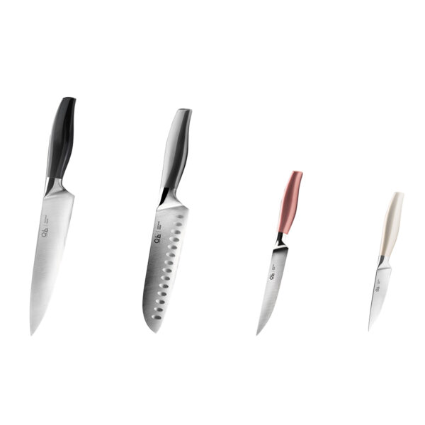 4 knives set with stainless steel blade and professional handle with coloured coating available in black, gold, silver and golden rose. Set composed of: 1 Paring knife (blade 8,5 cm); 1 Utility knife (blade 12,5 cm); 1 Santoku knife (blade 17,5 cm); 1 Chef knife (blade 20 cm).