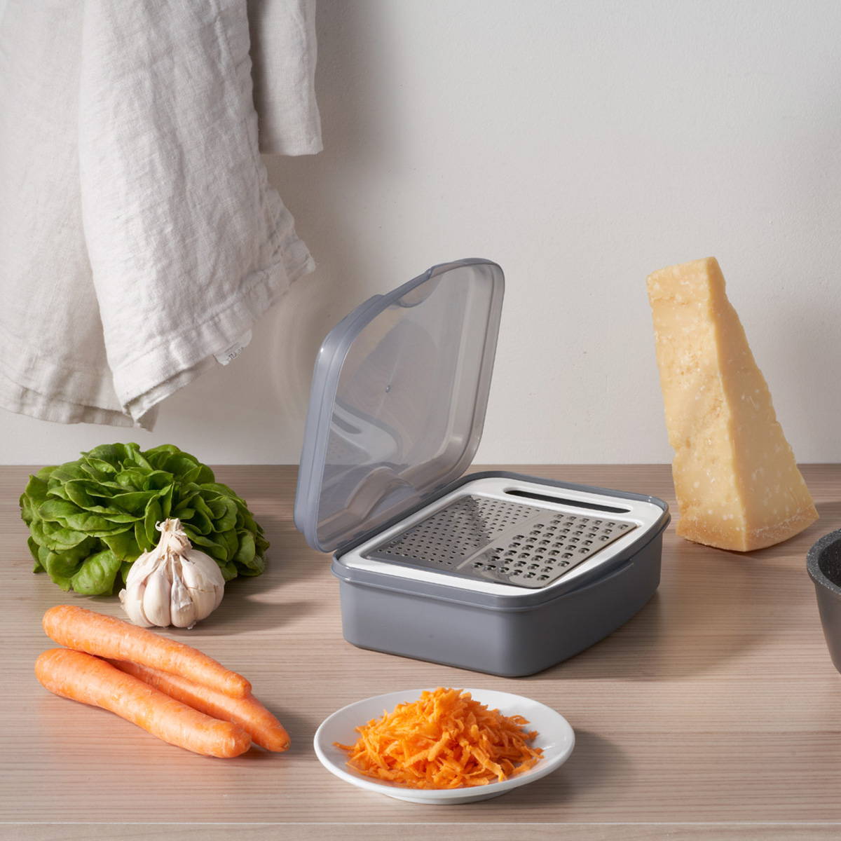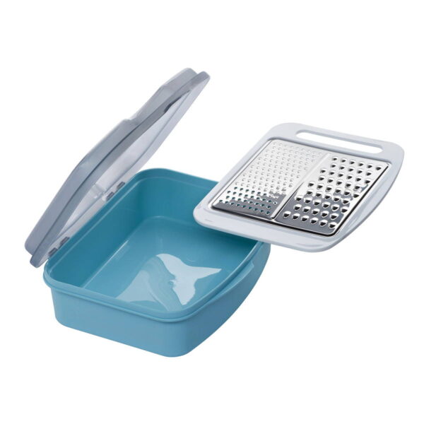 La linea Iris di Q.b. by Mopita si arricchisce di una grattugia multitaglio con contenitore. La grattugia in acciaio inossidabile è removibile e permette di grattugiare finemente o alla julinee direttamente nel contenitore, limitando gli sprechi e garantendo pulizia in cucina. Disponibile nelle combinazioni di colore grigio e bianco, grigio bianco e rosa e grigio bianco e azzurro. Senza BPA.