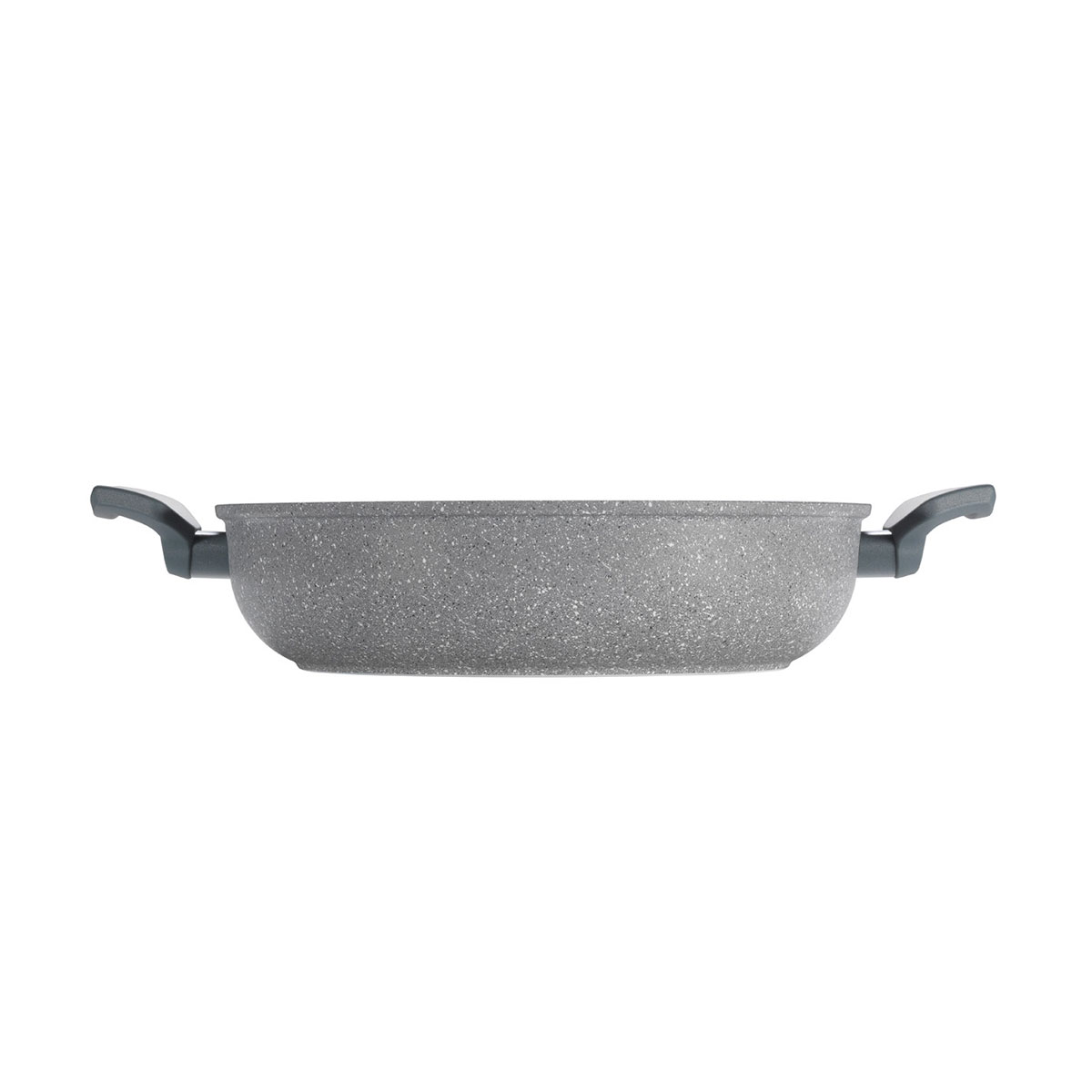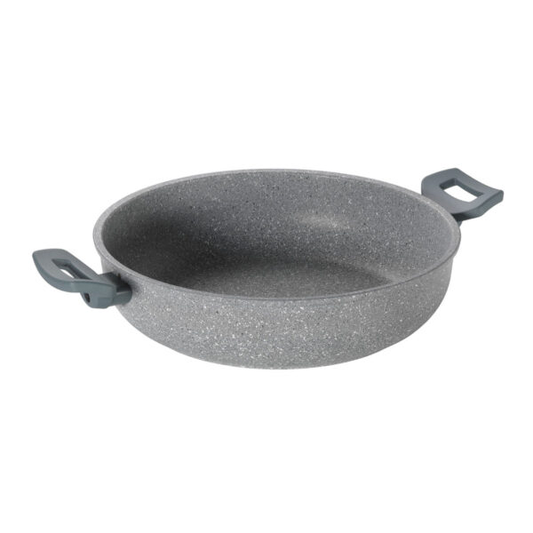 The main features of this shallow casserole are its flat base, low sides and two short handles. Like the other products in the “Roccia Viva” collection, the high thickness of the aluminium provides uniform heat distribution. The Bakelite handles are coated in silicone and there is a ‘stone effect’ coating on the inside.