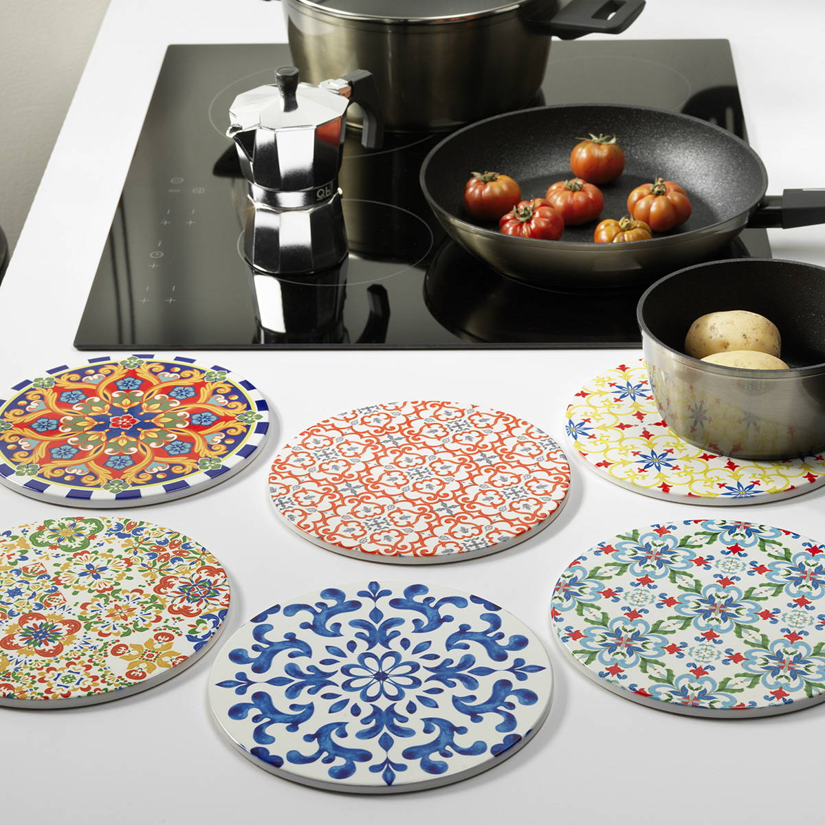 Sottopentola in ceramica con fondo antiscivolo e antigraffio in sughero. Prodotto disponibile in 6 decori.