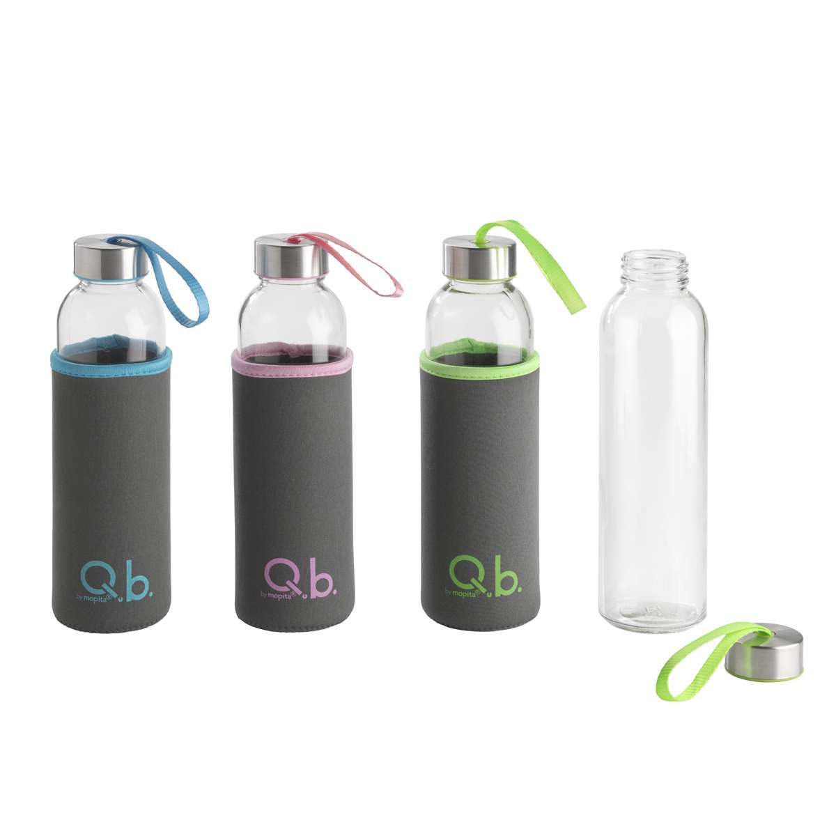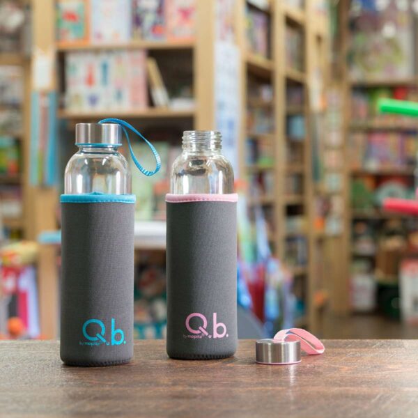 Glass bottle of the Sprint line of Q.b. by Mopita. The stainless steel cap closes hermetically the bottle. The neoprene cover protects the bottle during the carriage. Eco-friendly, reusable and recyclable. The ring on the lid allows to comfortably bring with you the bottle also when there is not enough space in your backpack or in your bag. Available in the colours: white pearl, pink, green and light blue.